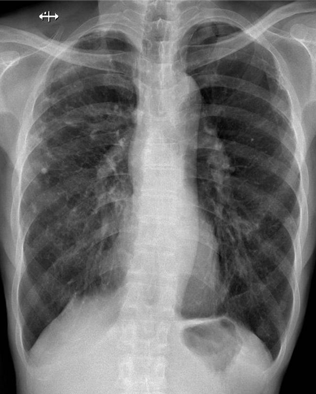 1-Xơ thâm nhiễm + khí phế thũng rải rác hai phổi 2-Dày dính màng phổi hai bên