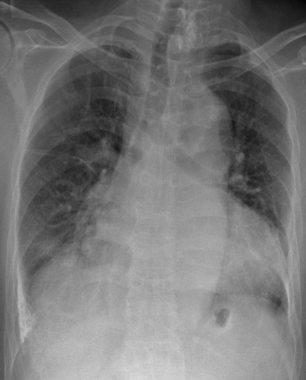 1- Cung động mạch chủ dãn 2-Tim (T) lớn 2-Đóng vôi màng phổi phải