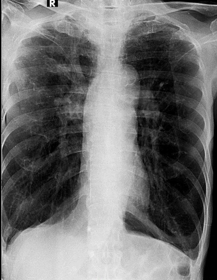 1-Xơ + khí phế thũng rải rác hai phổi 2-Bóng tim nhỏ