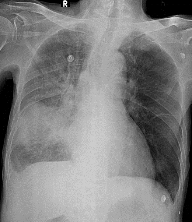1-Khí quản lệch (P) 2-Viêm phổi (P) lan tỏa 3-Tràn dịch màng phổi (P) 4-Cung động mạch chủ đóng vôi