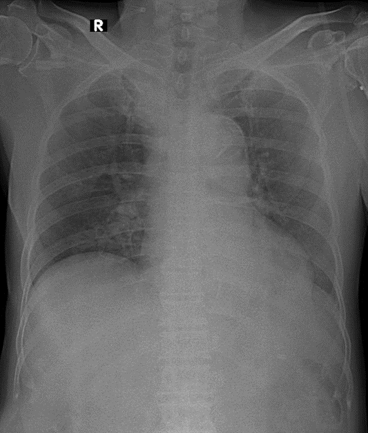 1-Thâm nhiễm phế nang lan tỏa thùy dưới phổi (P) 2-Cung động mạch chủ dãn 3-Cung động mạch chủ đóng vôi 4-Tim (T) lớn [dày thất trái ]