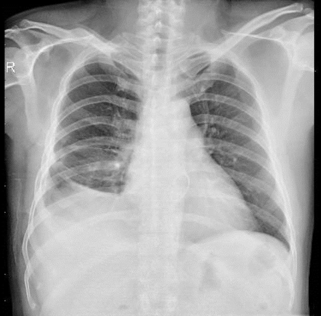 1-Thâm nhiễm lan tỏa thùy dưới phổi (P)=>Viêm phổi 2-Tràn dịch màng phổi (P) 3-Gãy cũ 1/3 giữa xương đòn(P)