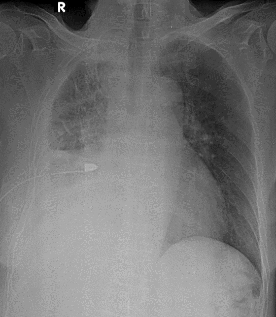 1-Thâm nhiểm phế nang lan tỏa phổi (P)=> VIÊM PHỔI 2-Tràn dịch màng phổi (P) lượng trung bình 3-Cung động mạch chủ dãn 4-Đang dẩn lưu màng phổi (P)