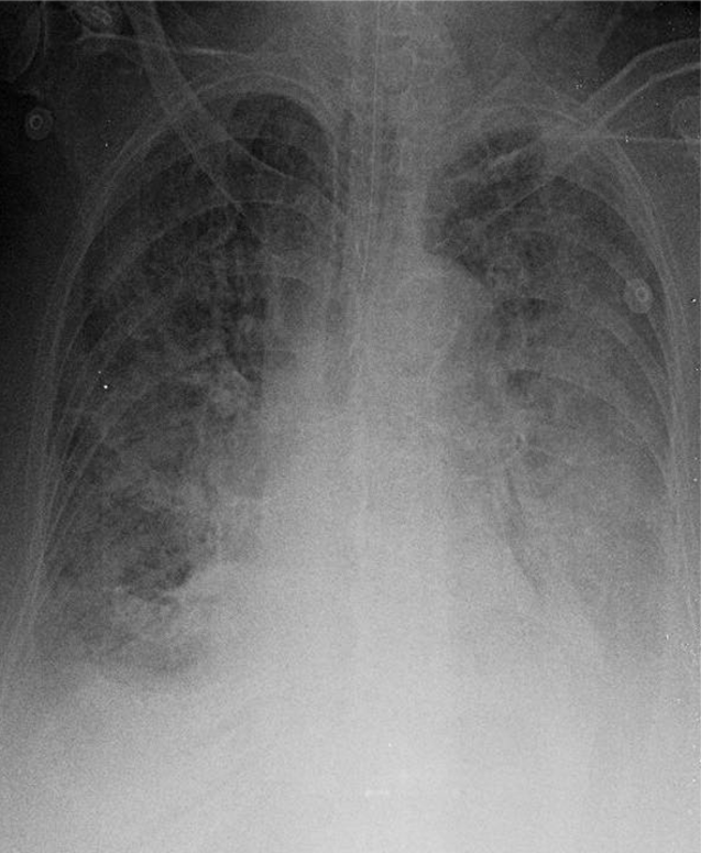 1-Thâm nhiễm phế nang lan tỏa hai phổi => Viêm phổi 2-Tràn dịch màng phổi hai bên 3-Cung động mạch chủ dãn