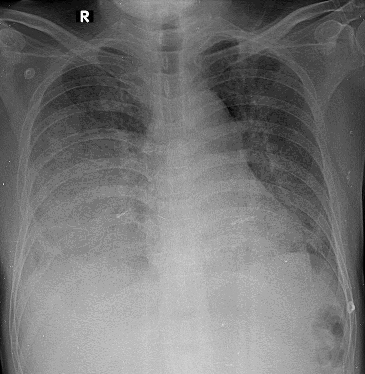 1-Thâm nhiễm phế nang lan tỏa hai phổi => Viêm phổi 2-Tràn dịch màng phổi (P)