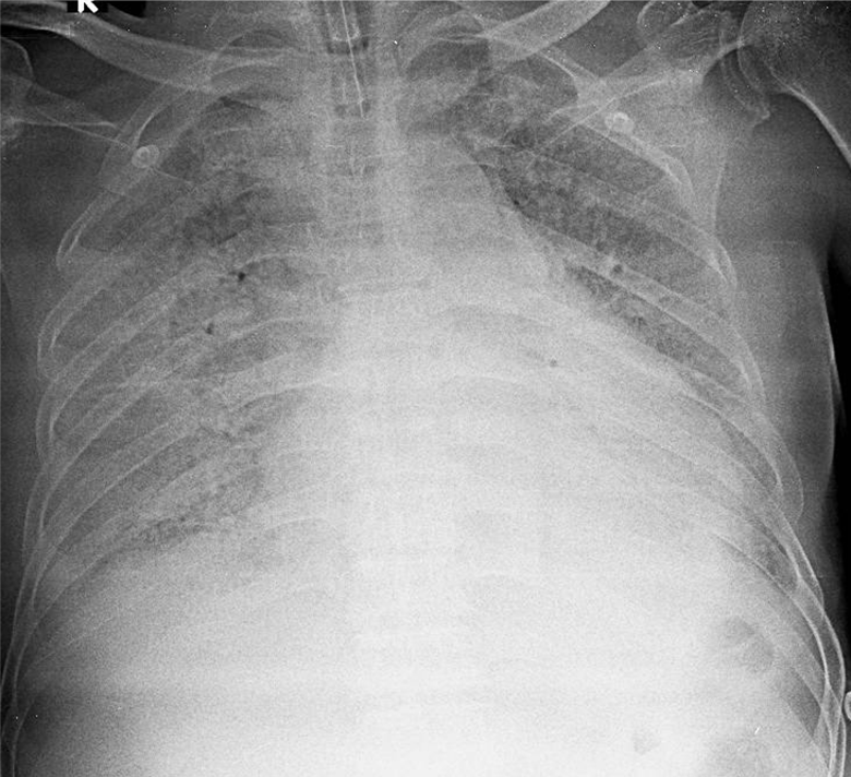 1-Đang đặt nội khí quản 2-Tổn thương mô kẻ rải rác hai phổi => Viêm phổi, lao kê, ... 3-Tim to