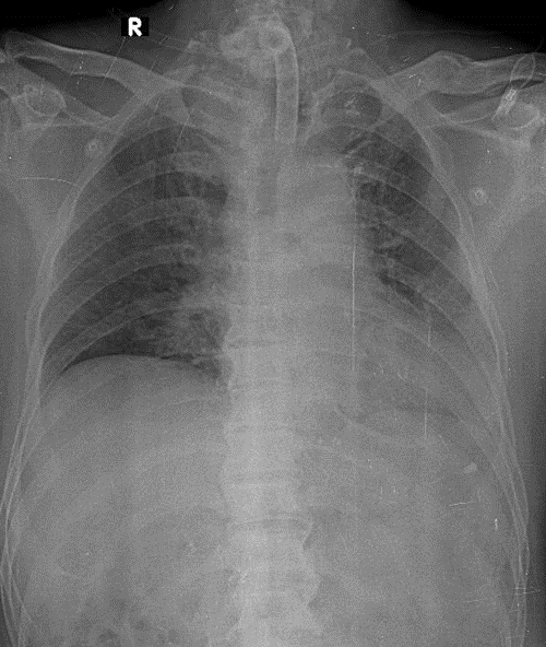 1-Đang đặt dụng cụ canul mở khí quản ra da 2-Thâm nhiểm thùy trên phổi (T) 3-Gãy 1/3 giữa xương đòn (T)
