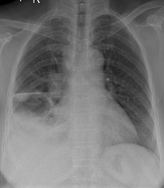 1-Tổn thương mờ đồng nhất thùy dưới phổi (P)=> Viêm phổi + đông đặc phổi 2-Tràn dịch màng phổi (P) 3-Nhiều cấu trúc dạng hạch vùng rốn phổi (P)