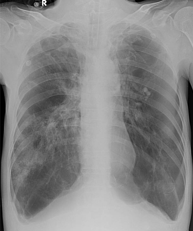 1-Xơ + khí phế thũng rải rác hai phổi 2-Viêm thùy giữa và thùy dưới phổi (P) 3-Tràn dịch + Dày dính màng phổi hai bên 4-Bóng tim nhỏ