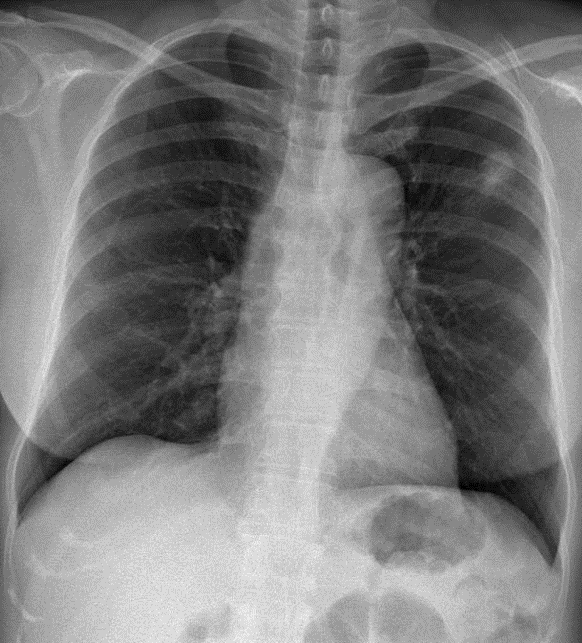 1-Nốt mờ thùy trên phổi (T) kèm thâm nhiễm vệ tinh xung quanh => U PHỔI (Tuberculoma, harmatoma, ...) 2-Đóng vôi sụn sườn trước hai bên