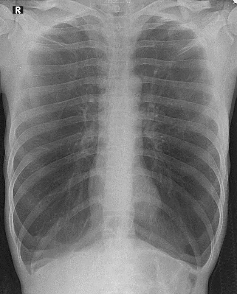 1-Khí phế thũng rải rác hai phổi 2-Bóng tim nhỏ