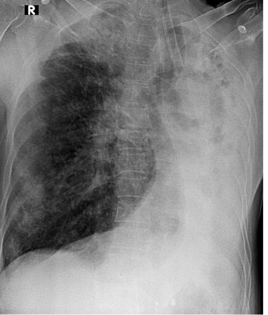 1-Khí quản lệch (T) 2-Có ống thông nội khí quản 3-Thâm nhiểm phế nang + khí phể thũng rải rác phổi (P) => Viêm phổi (P) 4-Viêm phổi + xẹp phổi (T), kéo bóng tim và trung thất lệch(T)