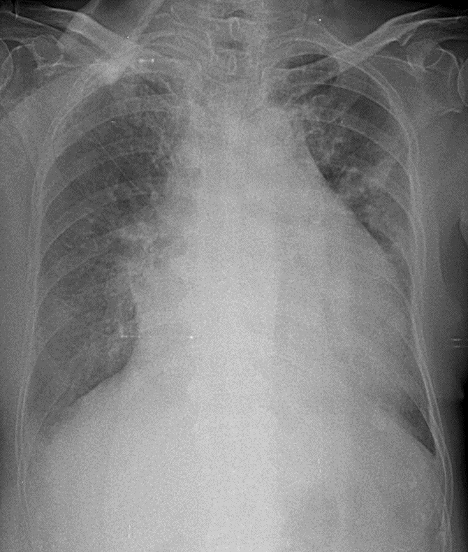 1-Thâm nhiểm mô kẻ rải rác hai phổi => Viêm phổi 2-Bóng tim to toàn bộ