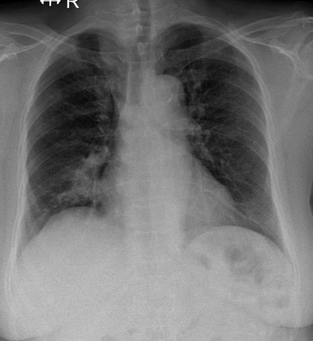 1-Thâm nhiểm phế nang thùy giữa phổi (P) => Viêm phổi 2-Cung động mạch chủ đóng vôi
