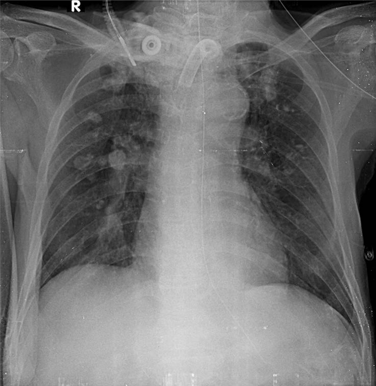 1-Đang mở khí quản ra da (canul) 2-Xơ vôi rải rác thùy trên hai phổi