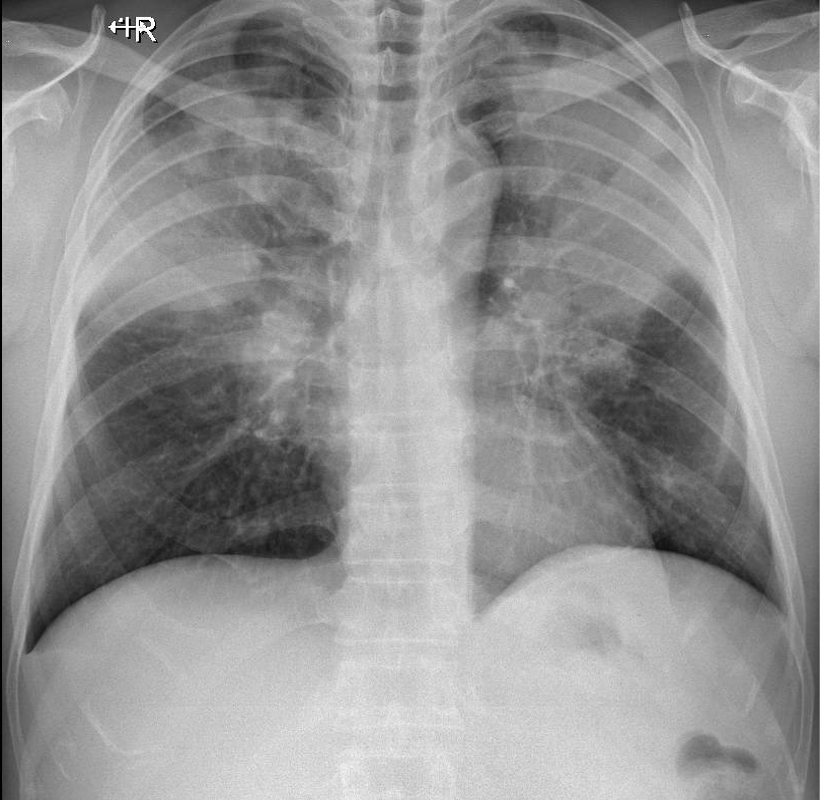 1-Tổn thương phế nang mờ đồng nhất lan tỏa thùy trên hai phổi => Viêm phổi