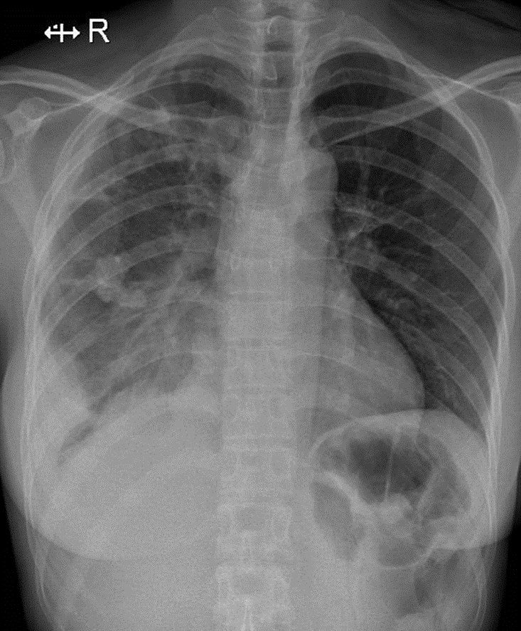 1-Tổn thương phế nang dạng nốt rải rác phổi (P) => Viêm phổi 2-Tràn dịch màng phổi (P)