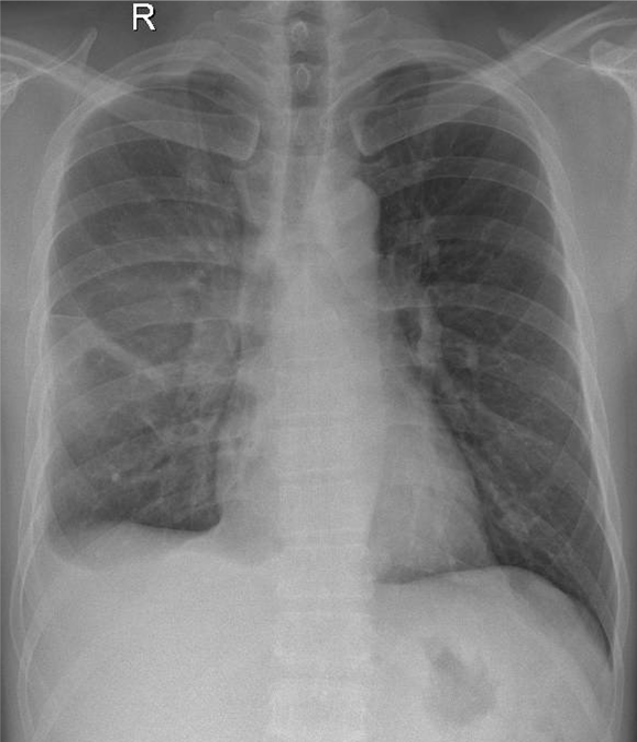 1-Tổn thương mờ đồng nhất vùng quanh rốn 1/3 giữa phổi (P) => Viêm phổi 2-Tràn dịch màng phổi (P) lượng ít