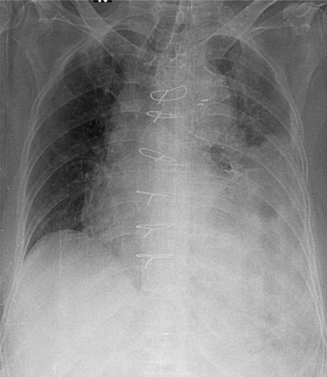 1-Khí phế quản lệch (P) kèm đóng vôi 2-Viêm thùy dưới phổi (T) 3-Tràn dịch màng phổi (T) 4-Cung động mạch chủ dãn kèm đóng vôi 5-Chỉ kim loại thành ngực dọc xương ức