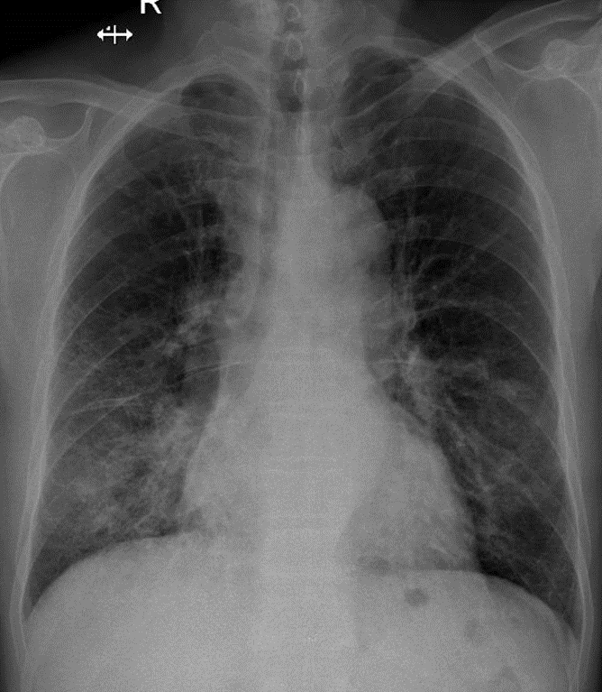 1-Thâm nhiễm phế nang và mô kè rải rác thùy dưới hai phổi => Viêm phổi